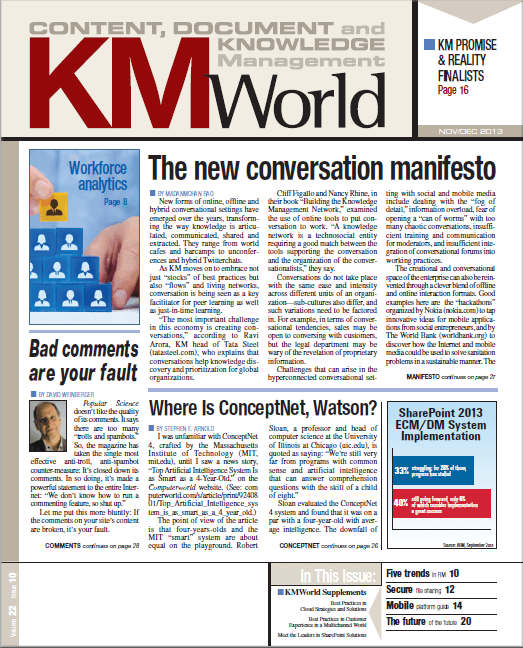 The winners of the KM Promise and the KM Reality awards will be formally announced on Thursday, Nov. 7, at the 2013 KMWorld Conference at the Renaissance Downtown Hotel in Washington, D.C.