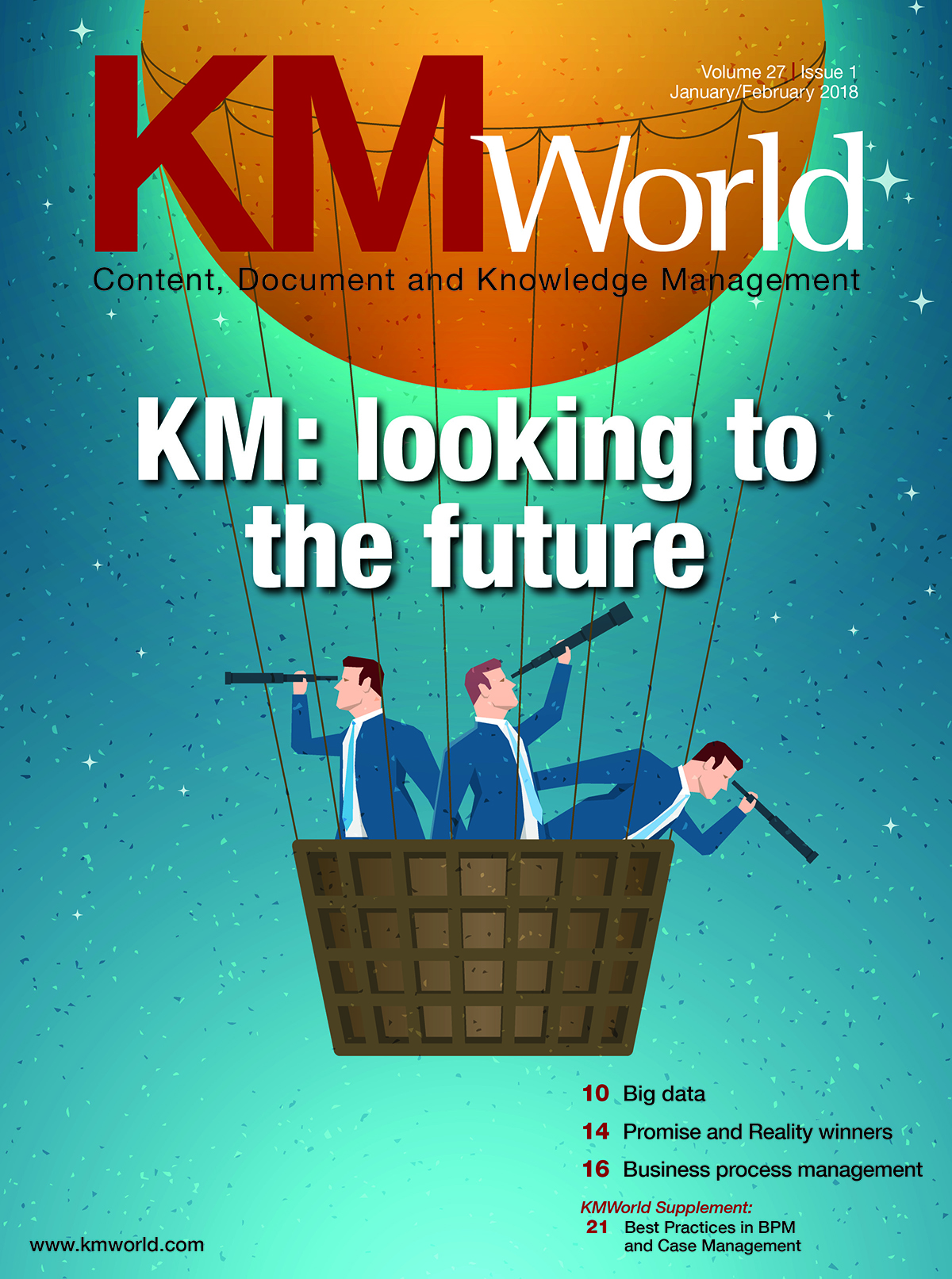 KMWorld 2017 offered conference sessions over three days on three tracks that focused on KM strategies, the digital workplace and collaboration. Several sessions looked at the impact of cognitive computing and AI on KM. The role of KM in enabling innovation was also a theme in several sessions. Developing a culture of learning, harnessing organizational knowledge and capturing lessons learned were discussed as ways of creating smarter organizations.